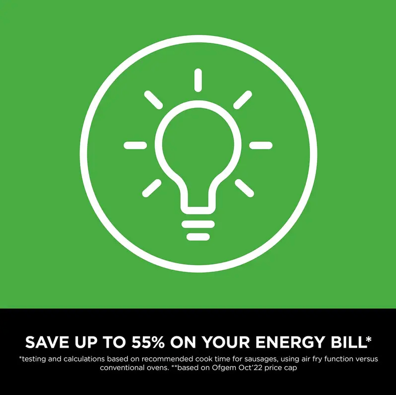 Cut down on your electricity bills while you cook. This rapid multi-cooker uses advanced air fry and steam technology to prepare full meals in less time and with up to 55% less energy than a conventional oven — helping you save money and the planet at the same time.